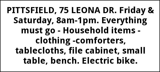 PITTSFIELD, 75 LEONA DR. Friday & Saturday, 8am-1pm. Everything must go - Household items - clothing -comforters, tablecloths, file cabinet, small table, bench. Electric bike.